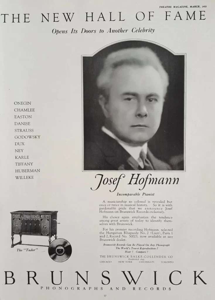 After producing several hours of these acoustical recordings – the final series being the aforementioned Brunswicks – Hofmann did not make more records when the microphone coming into use in 1925, despite the improved sonic framework and precision that this new technology permitted. The recent book Josef Hofmann: The Piano’s Forgotten Giant by Elizabeth Carr (click here) includes some fascinating insights drawn from letters that shed some light on his reasoning.